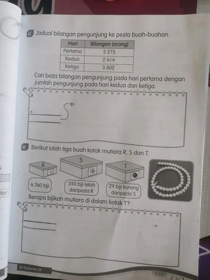 The first question involved determining the difference in numbers of visitors over three days to a fruit party. The second problem engaged students to calculate the quantity of pearls in a box, using given clues.