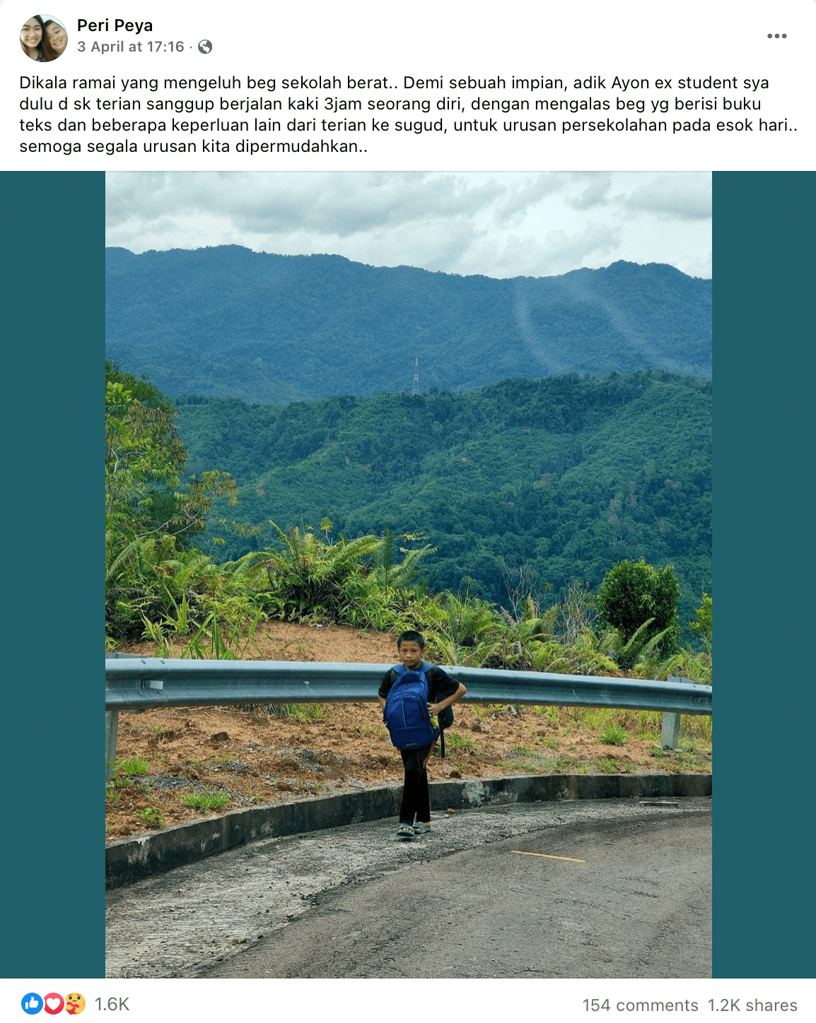 In a viral post, Ayon’s teacher, Fera Erna Boris shared that he had to walk 3 hours from his house to his school SK Terian.