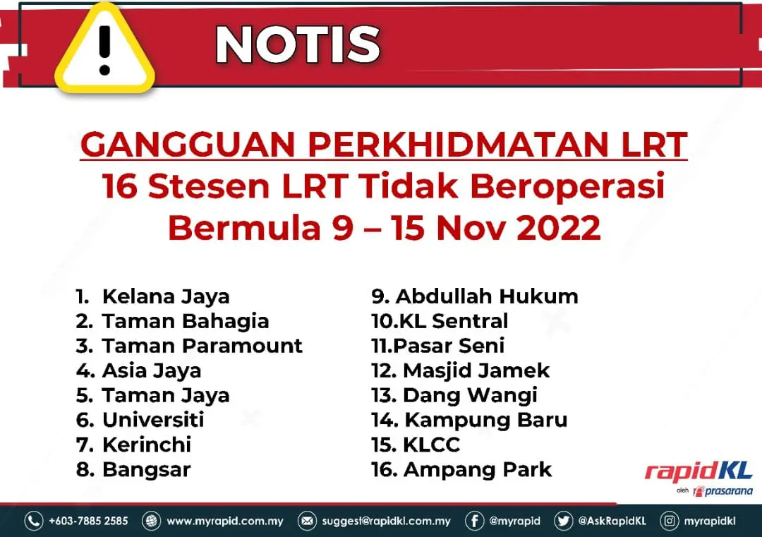 Following the breakdown of the Kelana Jaya LRT line yesterday, RapidKL announced this morning that 16 LRT stations will be suspended for 7 days starting today until Nov 15.