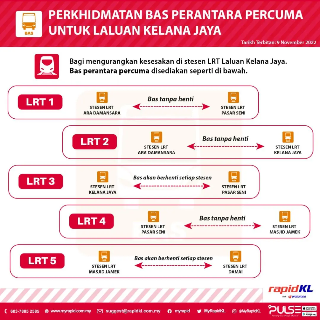 To ease the hassle of passengers, RapidKL will be providing free shuttle bus rides at four locations, namely the Ara Damansara LRT station, Kelana Jaya LRT station, Pasar Seni LRT station and Masjid Jamek LRT station.