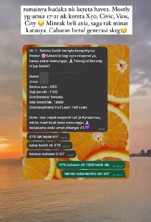 Recently, a female car sales assistant shared a screenshot of her conversation with a 19-year-old man interested in buying a car. What caught everyone’s attention was that, despite earning just RM1,100, the man intended to purchase a Proton X70.