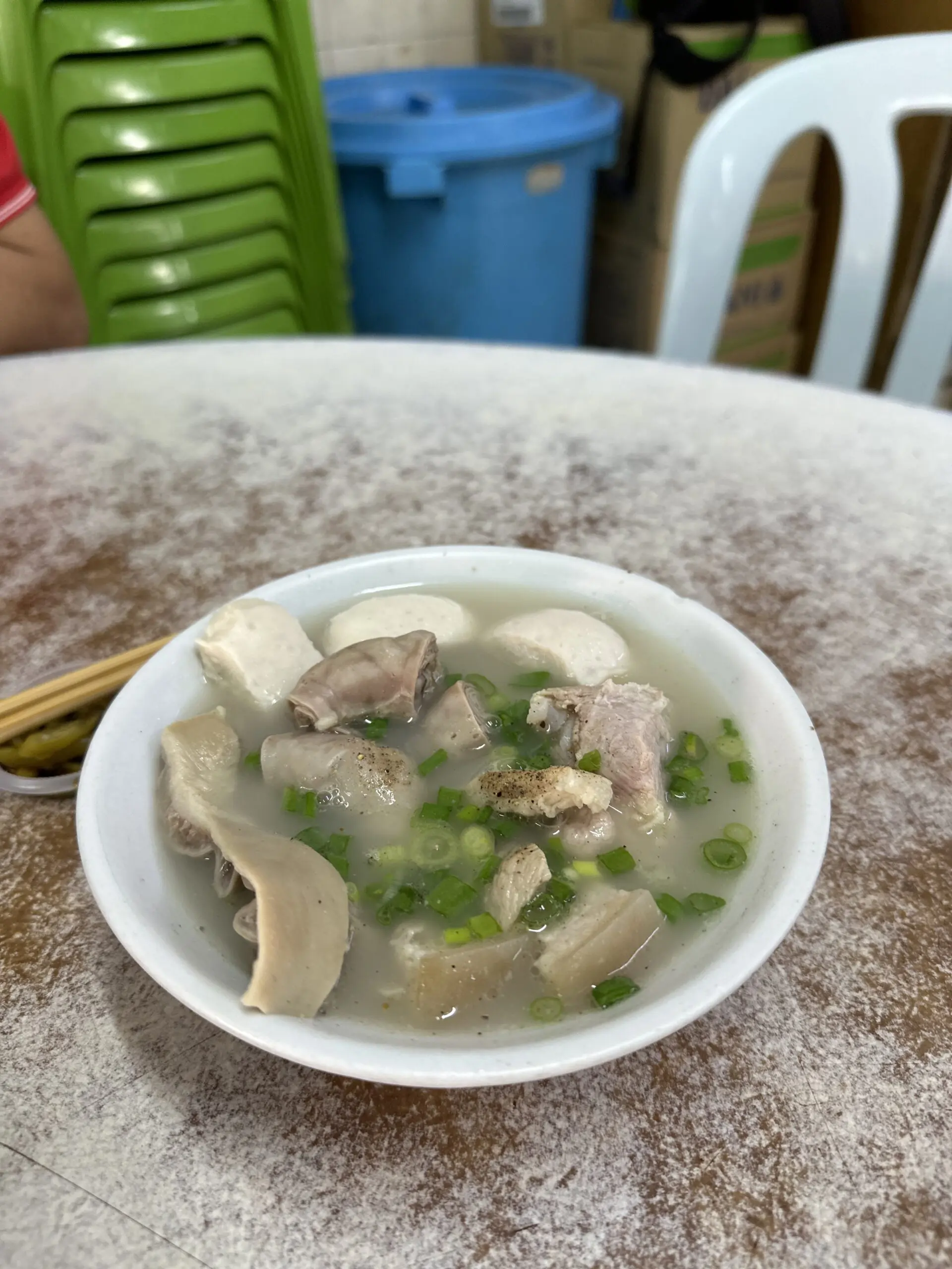 We ordered a white pepper mix pork noodle that had everything in it – pork tripe, ribs, shoulder, and pork balls served in a dry noodle style. Coincidentally, there was a special item available that weekend, which was pork intestines cooked.