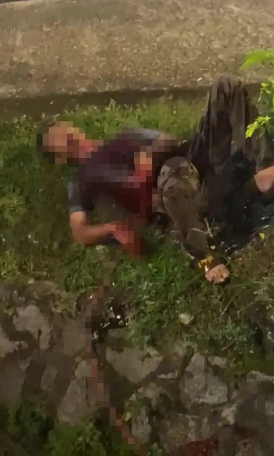 In the clip, parts of his intestines were seen spilling out and left hanging near a drain as he laid on the grass, leaving a bloody scene.