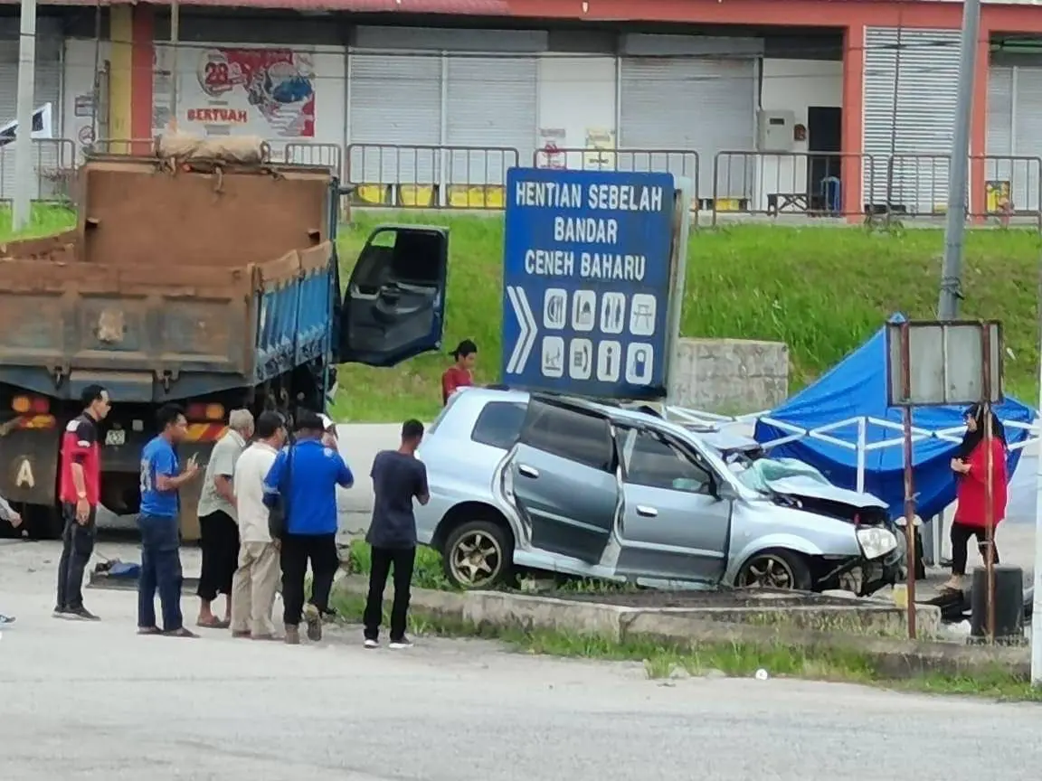 When they arrived at the accident site, their Naza Citra was hit by a 10-ton lorry carrying sand, believed to have lost control due to brake failure.