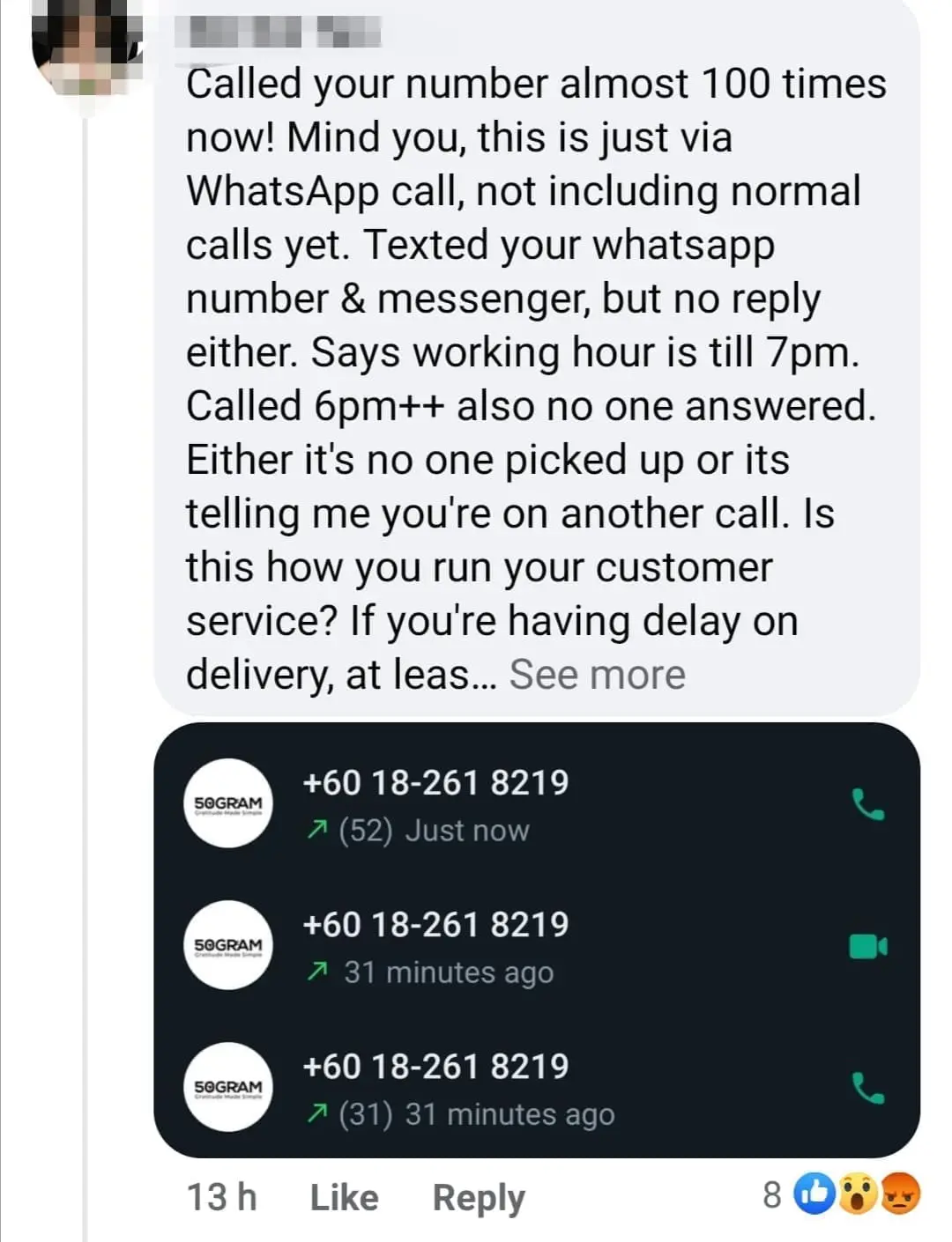 One netizen even claimed to have made close to 100 WhatsApp calls to 50Gram over her order but found herself talking to a brick wall instead.