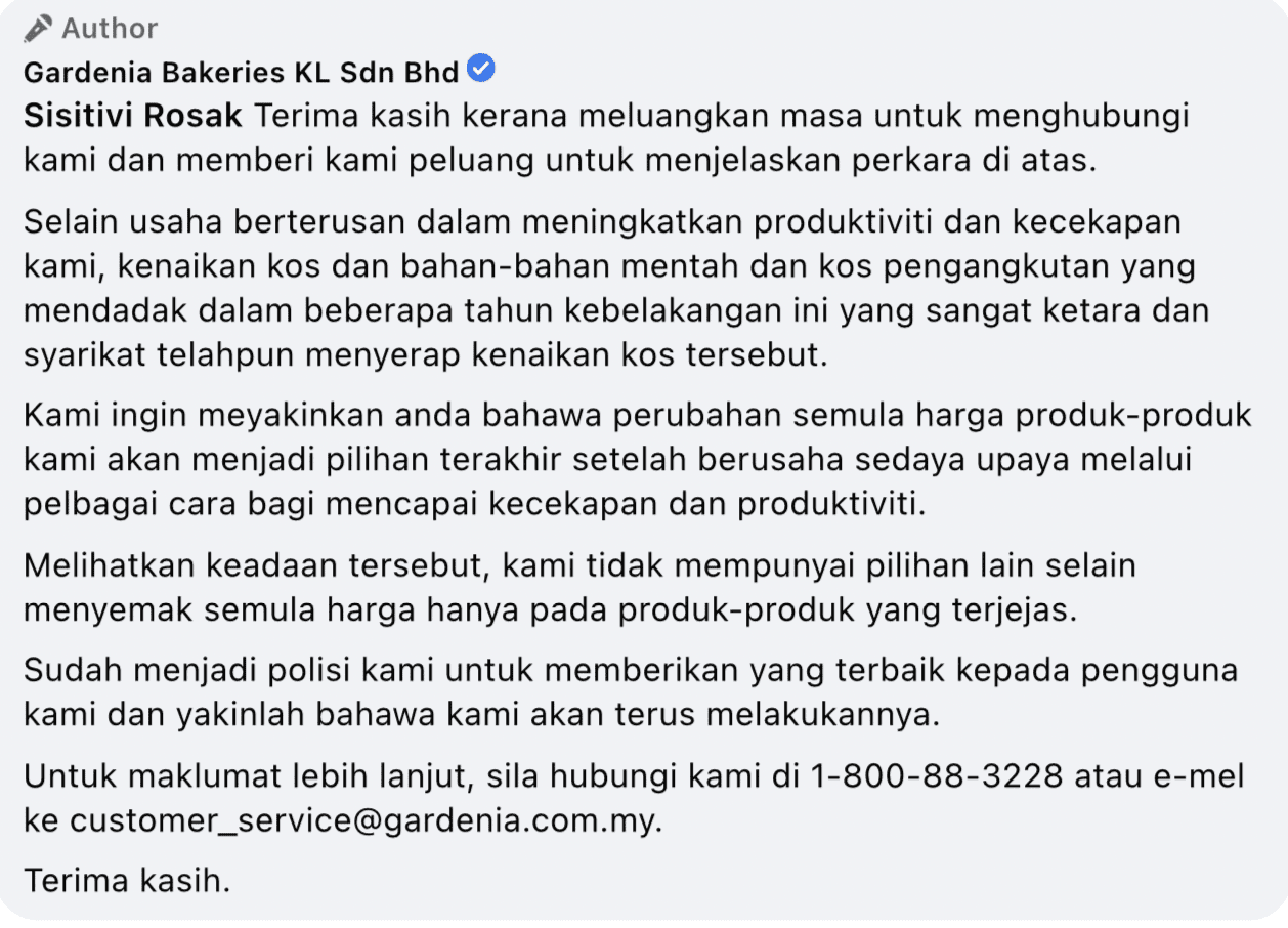 However, Gardenia assured that they are maintaining the price of its 500g Gardenia Bonanza Keluarga bread at RM2.75.