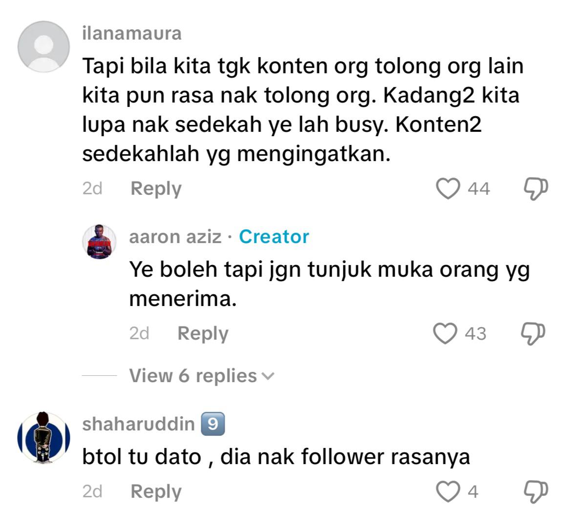 Menerusi hantaran di TikTok, Aaron atau nama lengkapnya Aaron Mustapha Aziz, 49, menjelaskan tindakan tersebut amatlah tidak wajar kerana ia boleh menjatuhkan maruah dan air muka penerima sedekah.