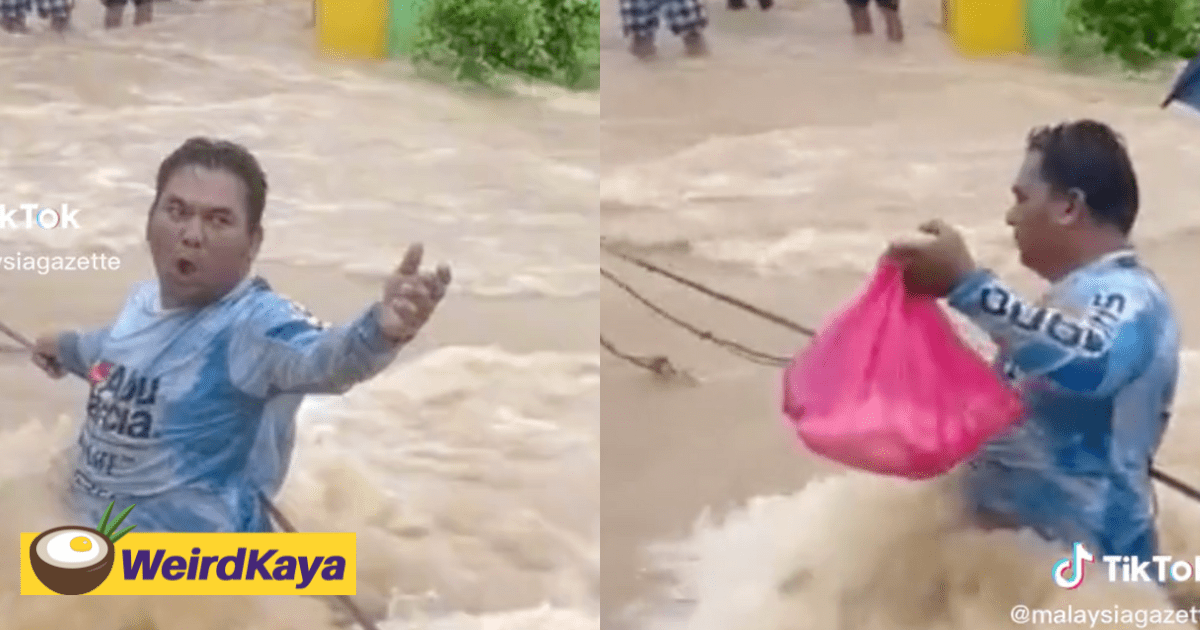 The incident was shared in a 26-second video on TikTok by user Zurainiswarno, showing Abang Salleh holding on to the rope and persevering through the strong current to deliver the aid.