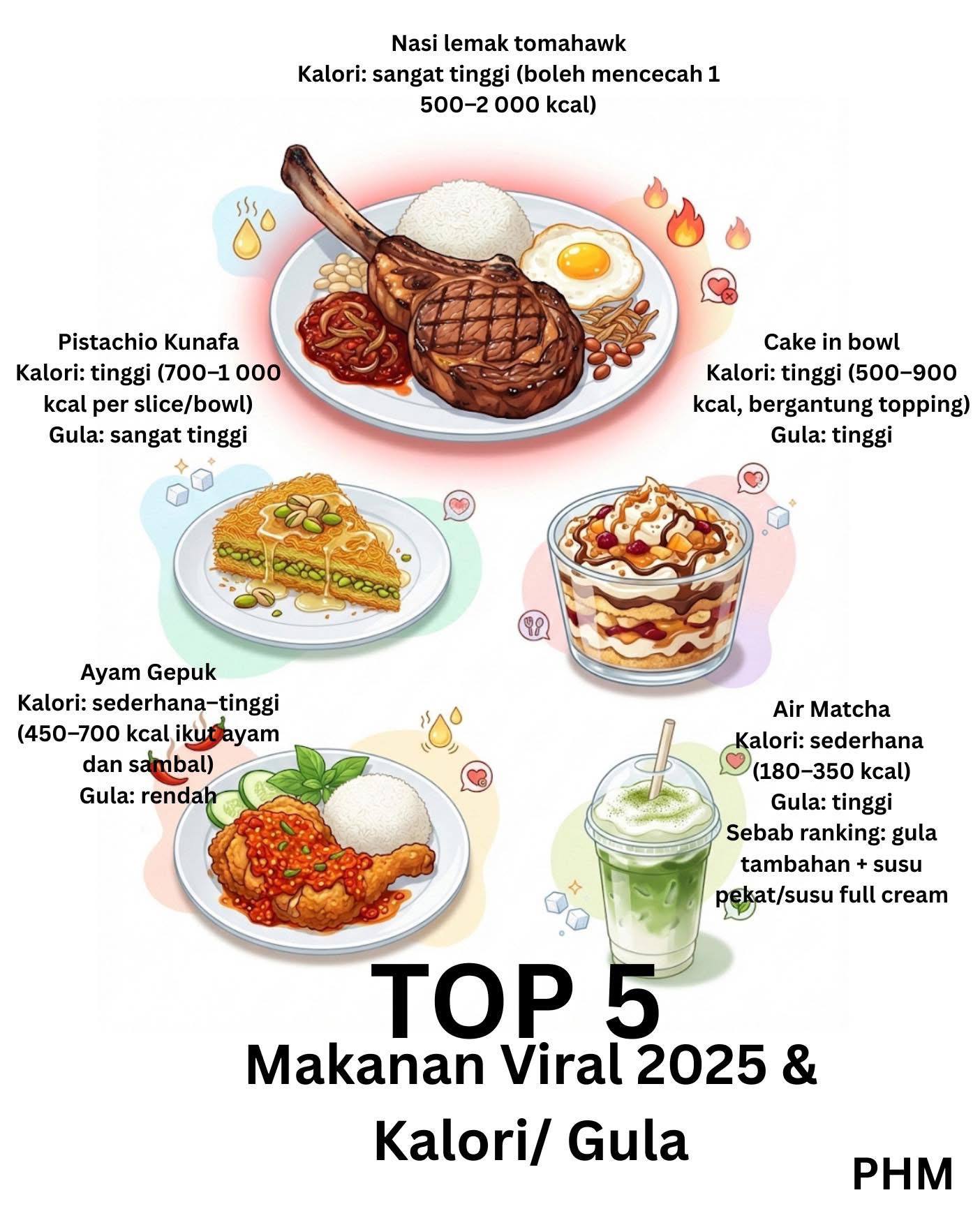 “Satu hidangan pun dah cukup untuk kalori satu hari. Nasi lemak tomahawk, cake in bowl, kunafa pekat syrup, air matcha manis berkrim. Portion besar, gula tinggi, tapi kita panggil itu “reward”,” terang PHS dalam kenyataan.