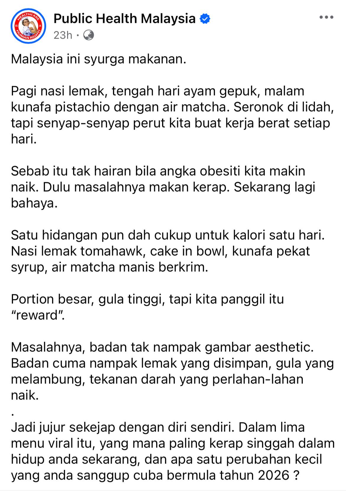 Jadi jujur sekejap dengan diri sendiri. Dalam lima menu viral itu, yang mana paling kerap singgah dalam hidup anda sekarang, dan apa satu perubahan kecil yang anda sanggup cuba bermula tahun 2026?,” tambahnya lagi.