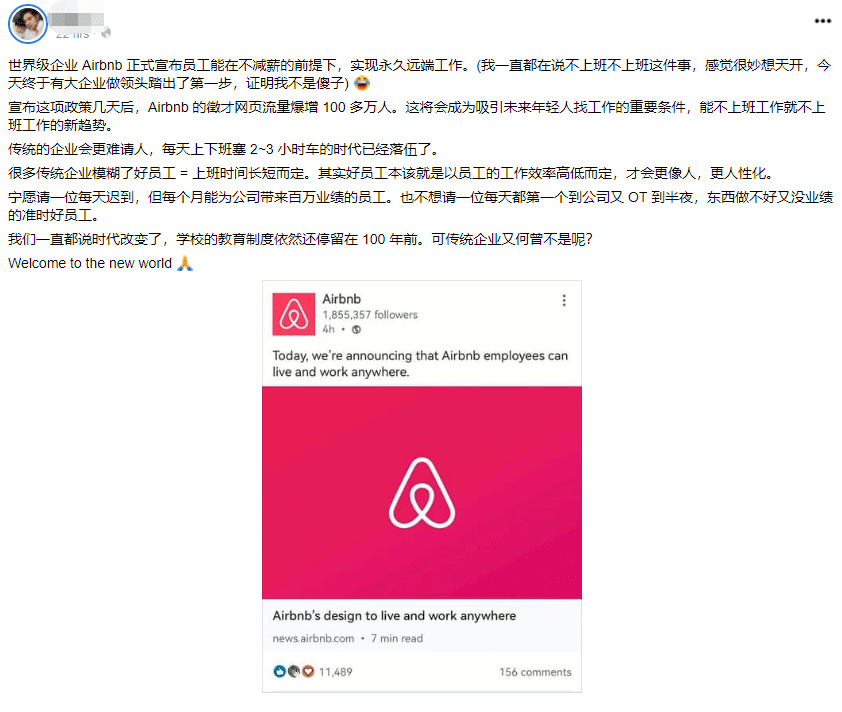 On Apr 28, Airbnb formally announced their initiative to allow all employees a lifetime work-from-anywhere experience, where you can live and work in over 170 countries for up to 90 days a year in each location!