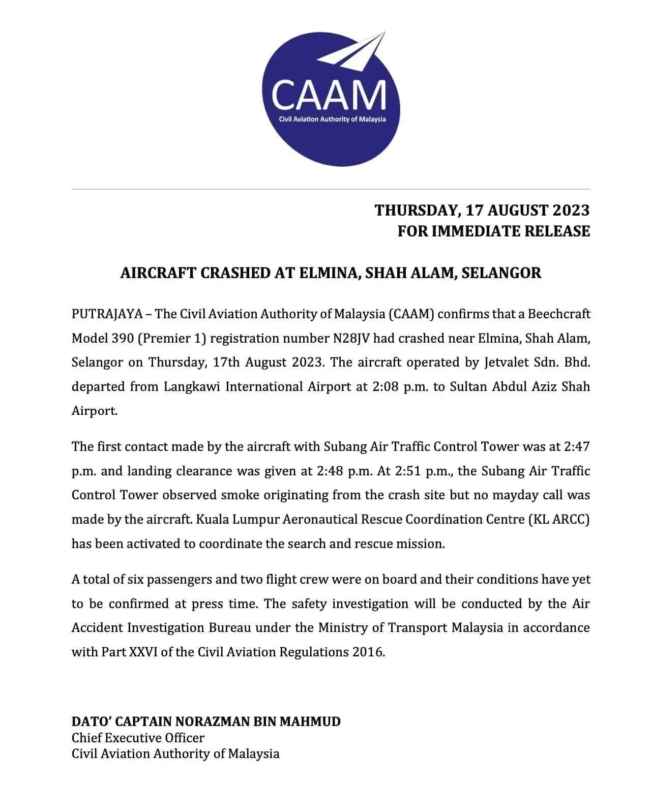 According to official statement, the Civil Aviation Authority of Malaysia (CAAM) has verified the tragic crash of a Beechcraft Model 390 (Premier 1) with the registration number N28JV.