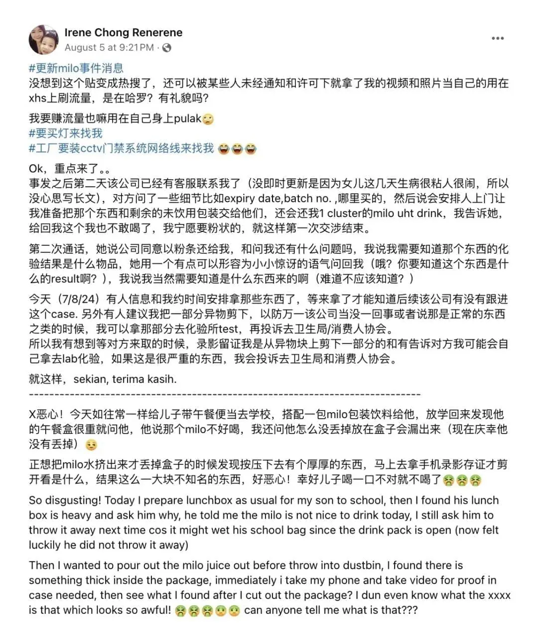 Dalam pada itu, Irene juga merakam detik-detik membuka minuman kotak terbabit untuk dijadikan sebagai bukti dan terkejut apabila menmui satu ketulan jijik di dalamnya.