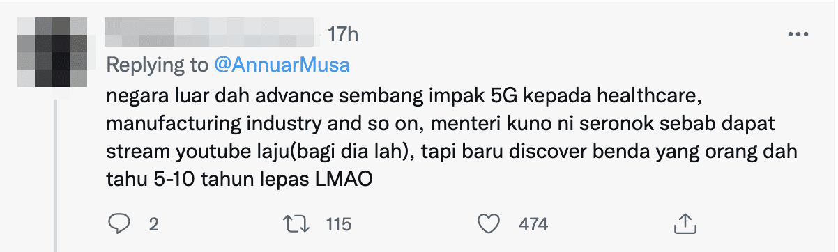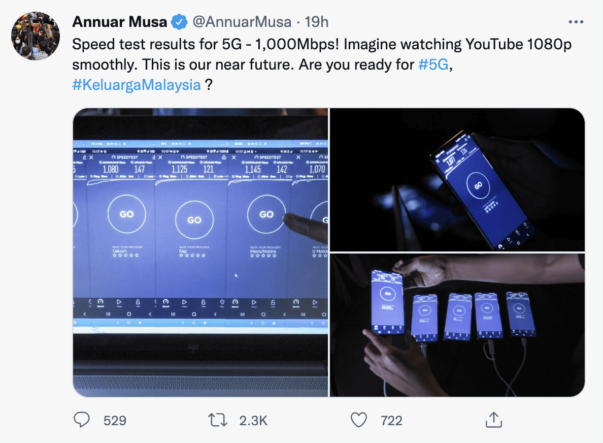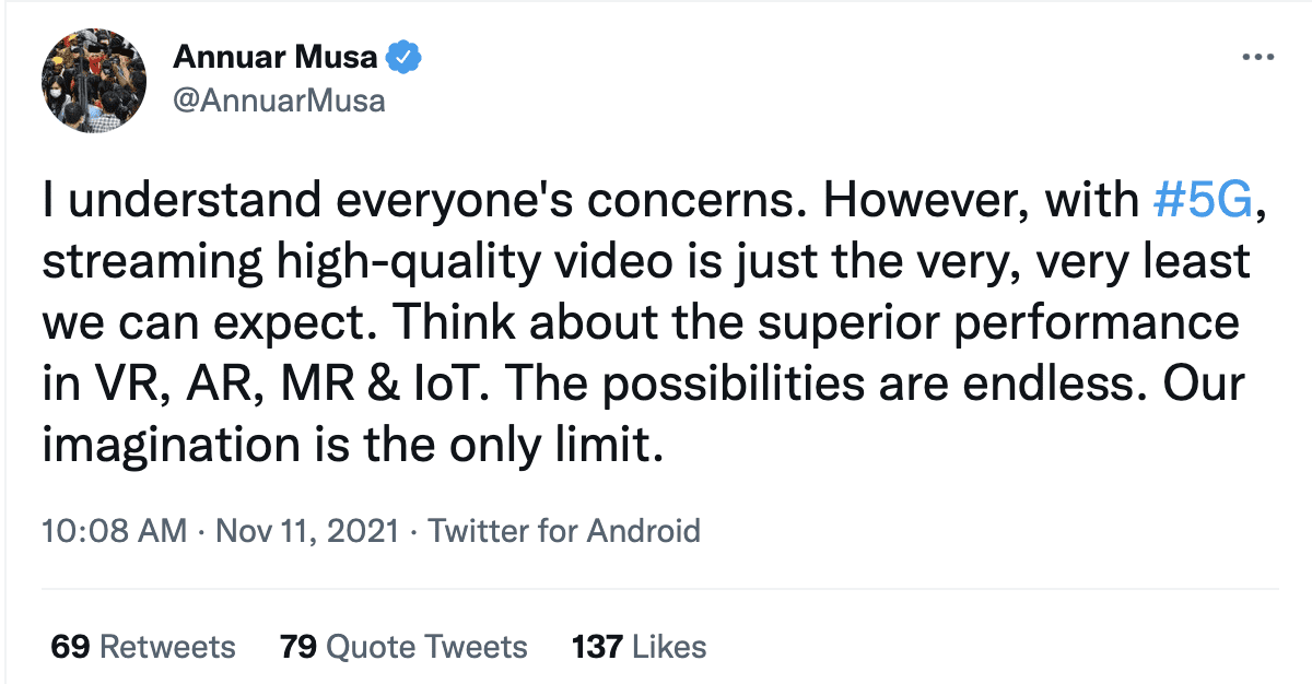 In a separate Tweet, Annuar clarified that streaming high-quality videos was just an example of the bare minimum one could enjoy with 5G technology.