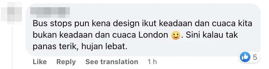 “Bus stops should be built according to the weather here, not the weather in London. The weather here is either skin-burning hot or heavy rain.”