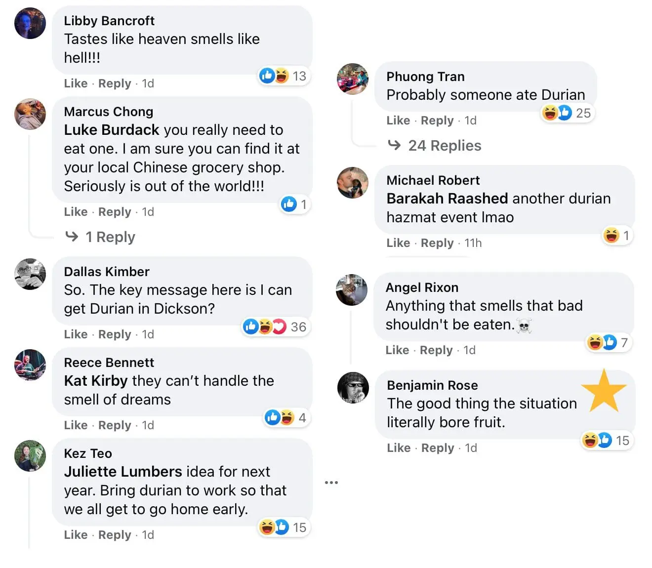 On Facebook however, it seemed that netizens could smell what was coming from a mile away, with one aptly summing up durians in all its pungent glory in this sentence: “Tastes like heaven smells like hell!”