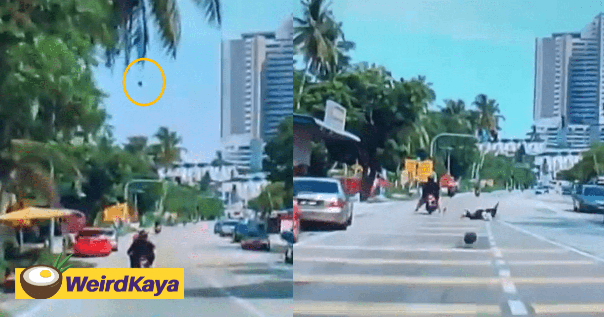 [VIDEO] Coconut falls from tree and knocks female passenger off motorbike