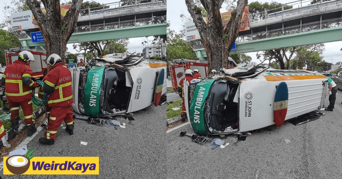 St John Ambulance Carrying Patient Flips Over After Slamming Into Divider In Penang