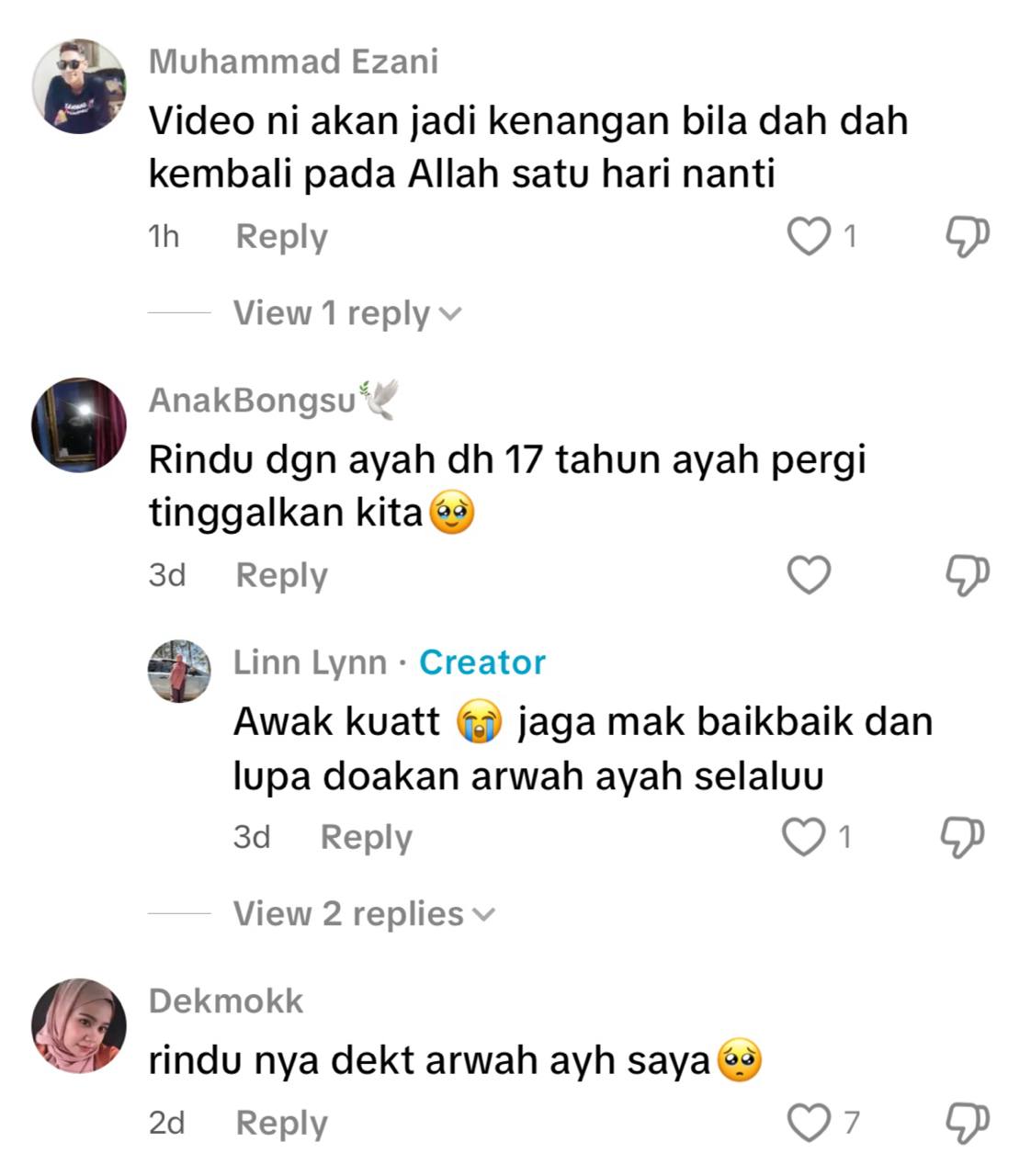 Malah ada juga wargamaya yang meluahkan rasa rindu kerana tiada lagi kasih sayang ibu dan bapa dan mendoakan agar mereka berdua berbahagia dan diberi peluang berjumpa di syurga nanti.