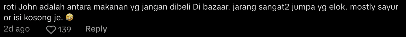 “Roti John is one of the foods you should avoid buying at bazaars. It’s very rare to find a good one. Mostly, it’s just veggies or an empty filling. 🤣”