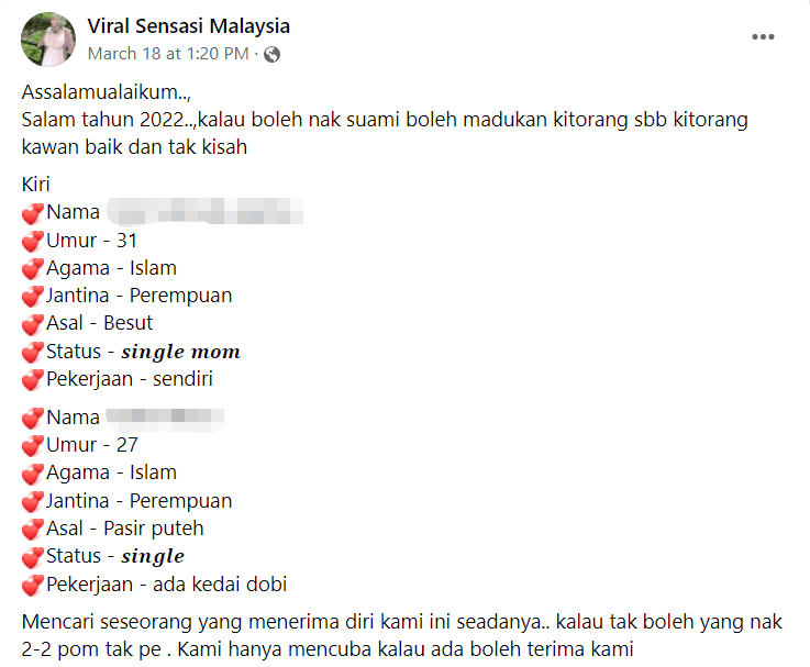 The Facebook page is widely known to be a platform for single Malaysian men and women to hopefully net the partner of their dreams.