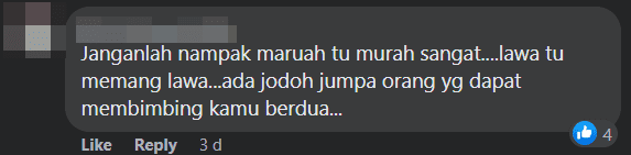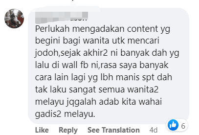 “Is it necessary to put up content like this for women to find a match? Many who are trying to find a match have been posting on this Facebook page recently. I feel that there are many other ways which are more genuine. We Malay girls should watch our behavior.”