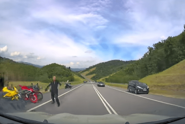 Thankfully, a driver noticed him in time and honked at him as a way to alert him. However, the biker returned the favor by swinging his arm towards the driver, causing him to let out a weak scream and swerve sharply to the right.