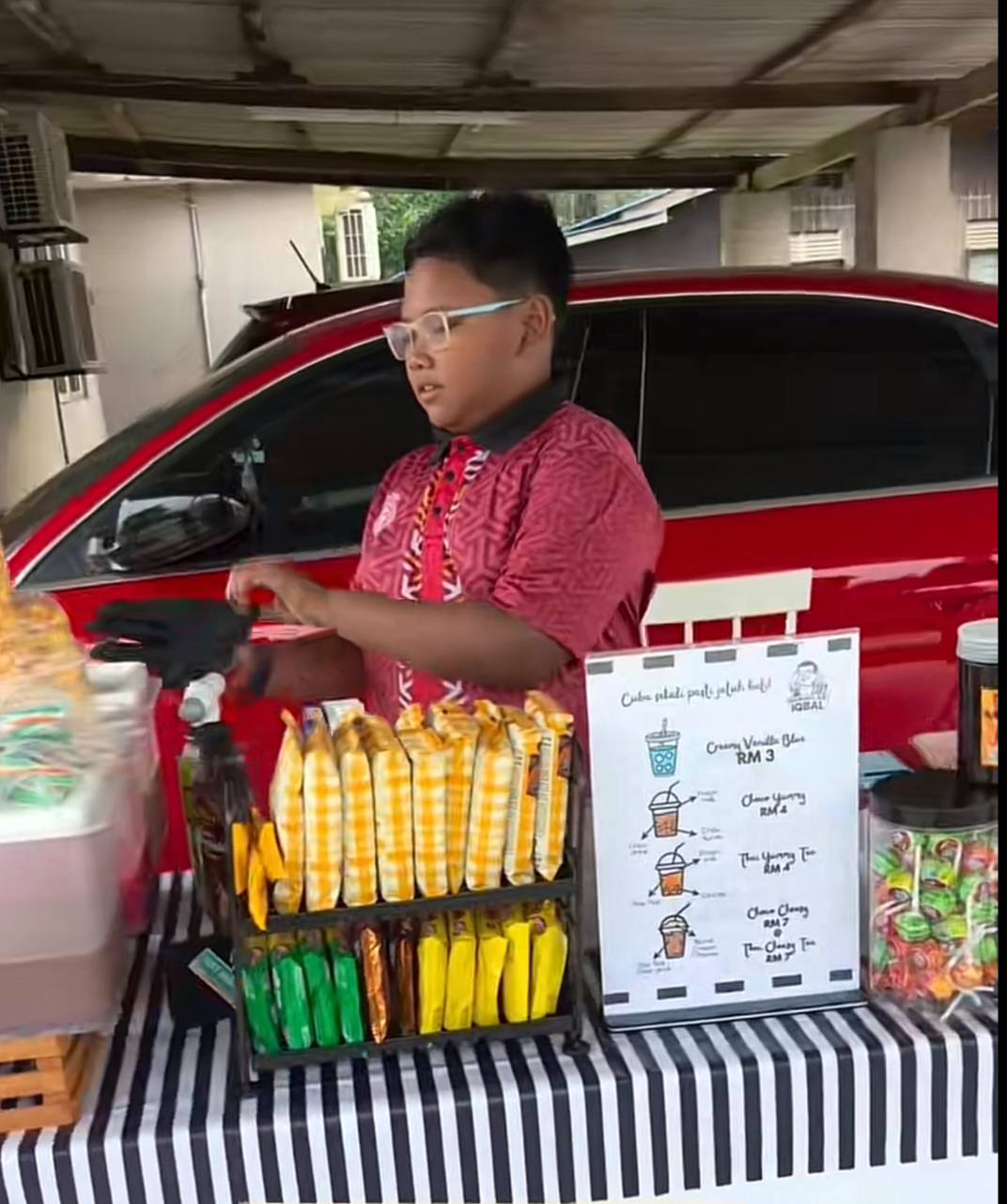 Oleh itu, si cilik yang dikenali sebagai Iqbal mengambil inisiatif untuk membuka gerai menjual air di hadapan rumahnya sebagai usaha mencari wang.