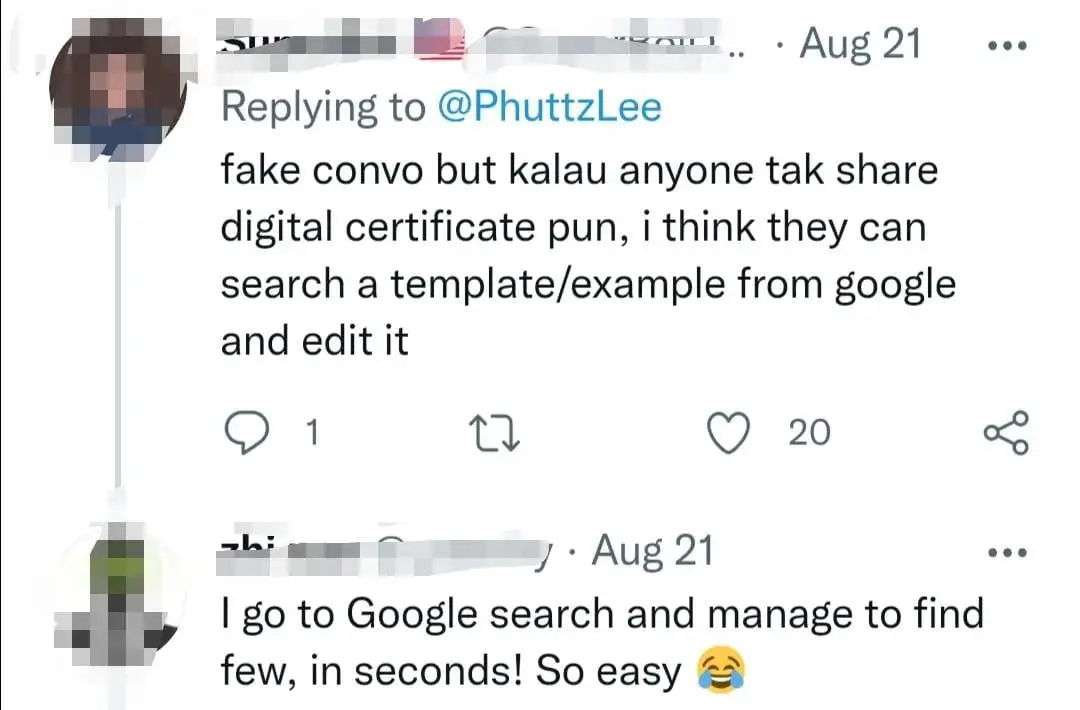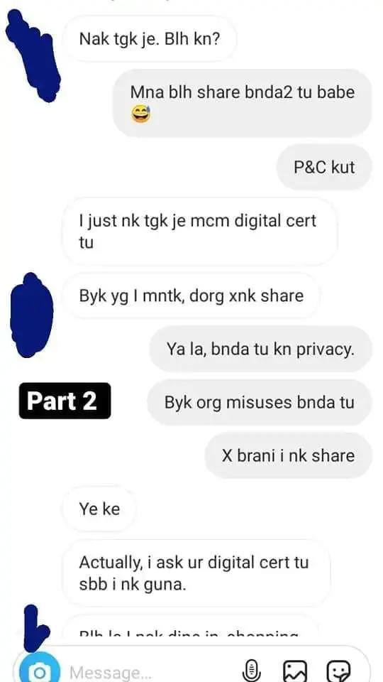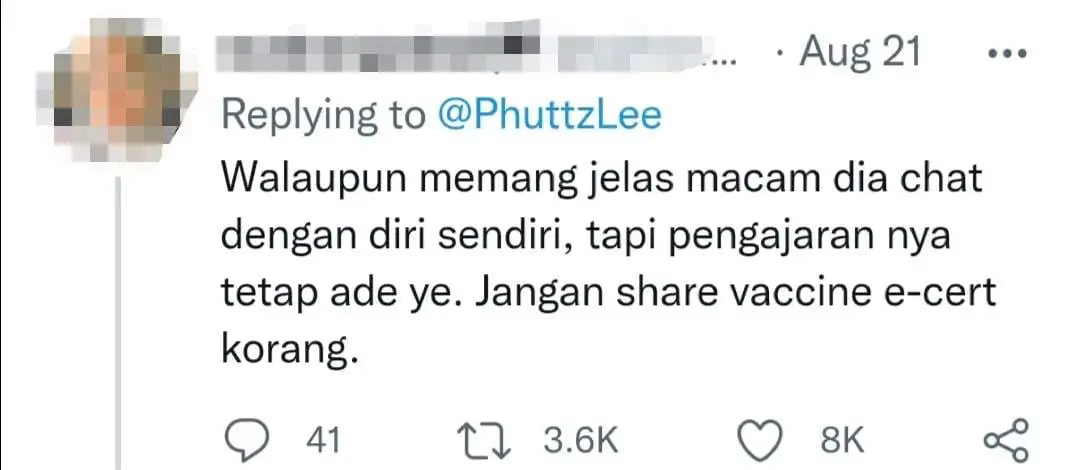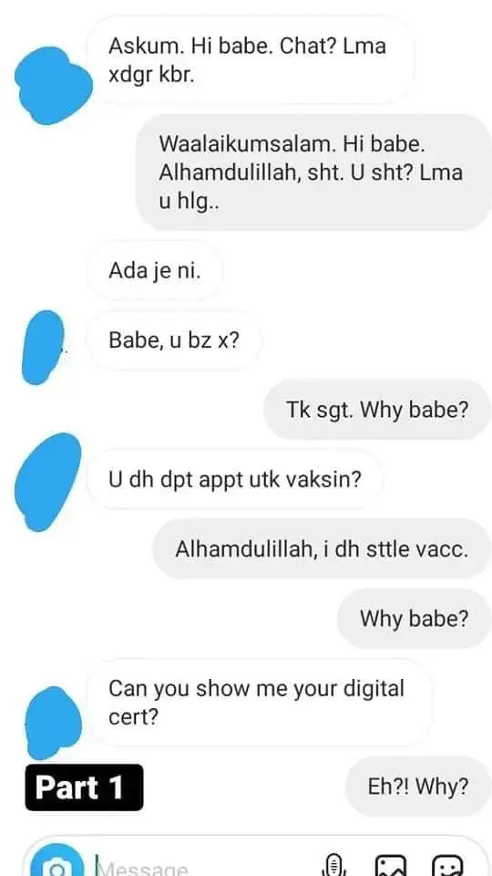 “Even though it is obvious that the conversation is fake, but the lesson to the public is there. Never share your vaccine cert to others.”