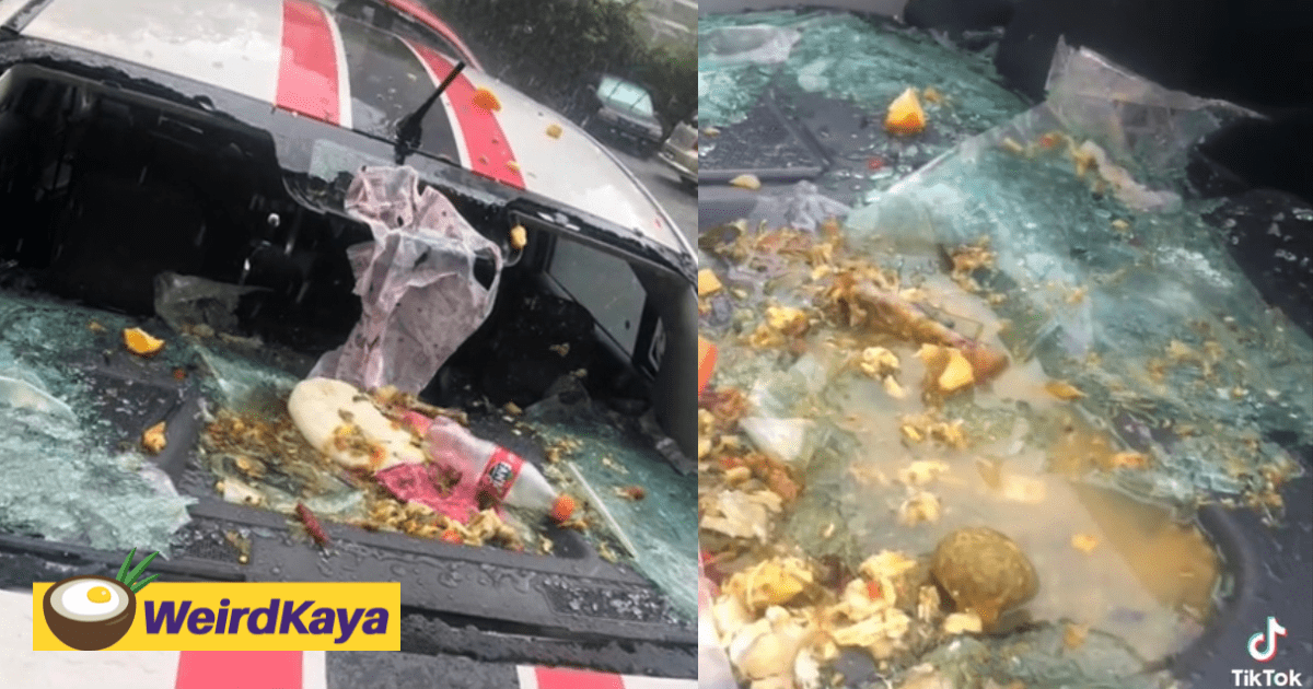 In a TikTok video by @piqahhhhs_, she showed how her father’s car windscreen was smashed to bits after a selfish resident threw rubbish from the top floor of a low-cost flat.