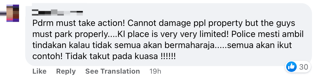 “PDRM must take action! [One] cannot damage other’s property … KL [parking] place is very very limited! Police must take action if not everyone will become sovereign….. All of them will follow this behaviour! Didn’t fear of authorities!”