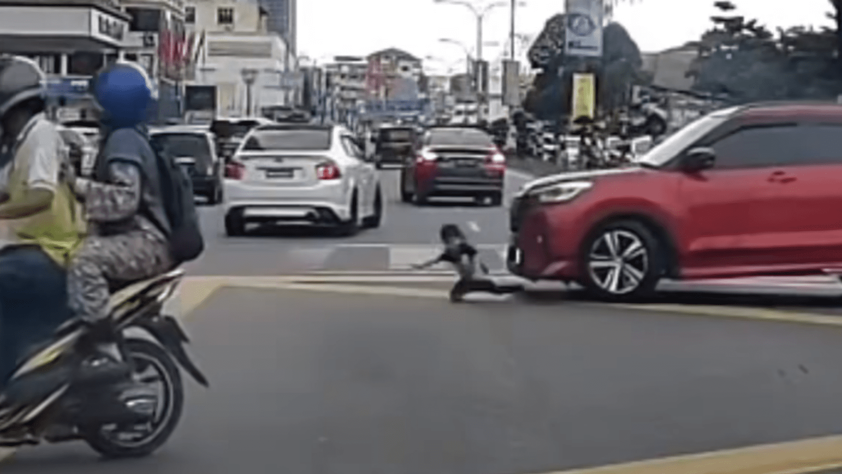 While the car immediately behind managed to swerve away, an oncoming Perodua Attiva SUV couldn’t avoid the child and hit them.