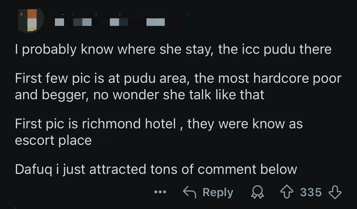 One speculated that the tourist’s travel experience was worsened by the fact that she stayed near the ICC Pudu area, which is notorious for its seedy environment.