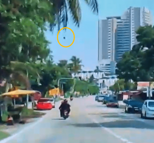 Seorang pembonceng motosikal cedera selepas buah kelapa terjatuh di atasnya ketika melalui Jalan Teluk Kumbar, Pulau Pinang. Kejadian yang menimpa individu berkenaan tular di media sosial namun, tiada kenyataan rasmi dikeluarkan setakat ini daripada pihak berkuasa serta PBT. pic.twitter.com/z4beQBpAdY