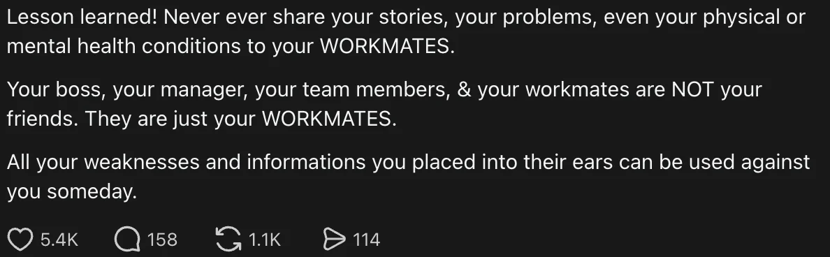 Lesson learned! Never ever share your stories, your problems, even your physical or mental health conditions to your WORKMATES.