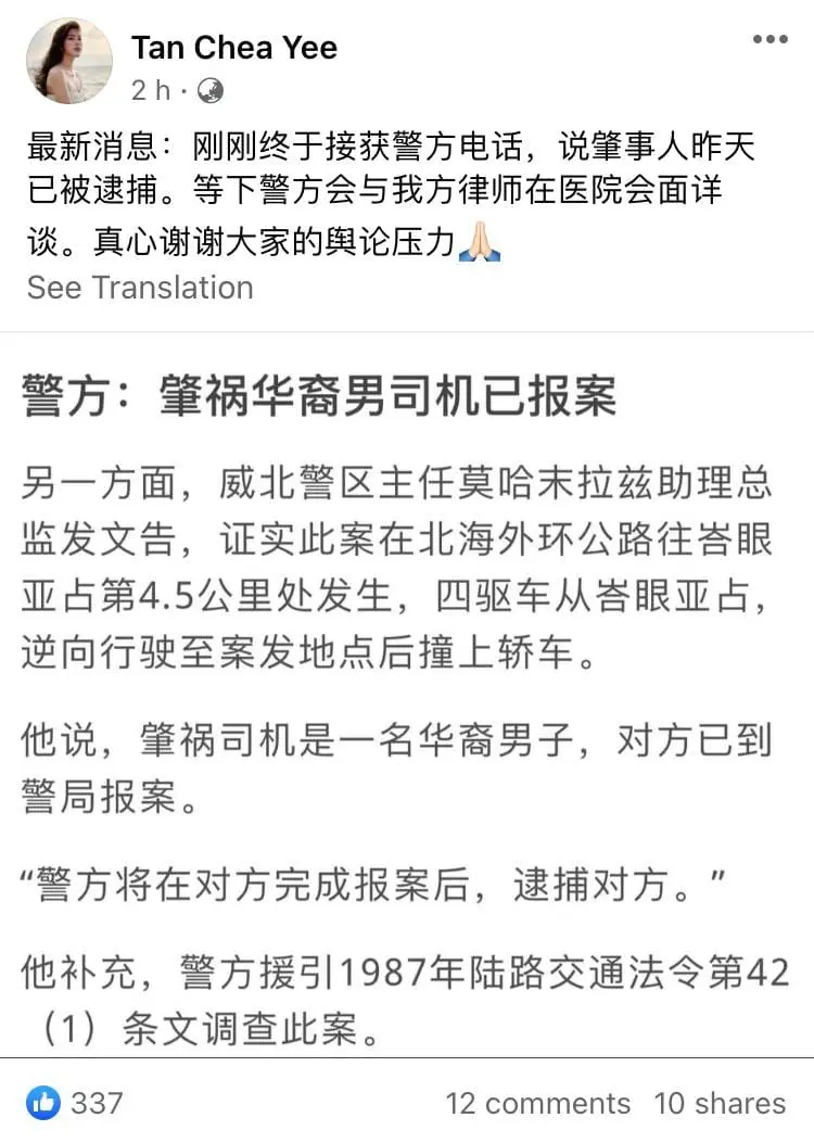 According to a Facebook post by Tan Chea Yee, she wrote that she and her boyfriend were coming back from Bukit Mertajam at around 11pm when the four-wheel drive collided into them.