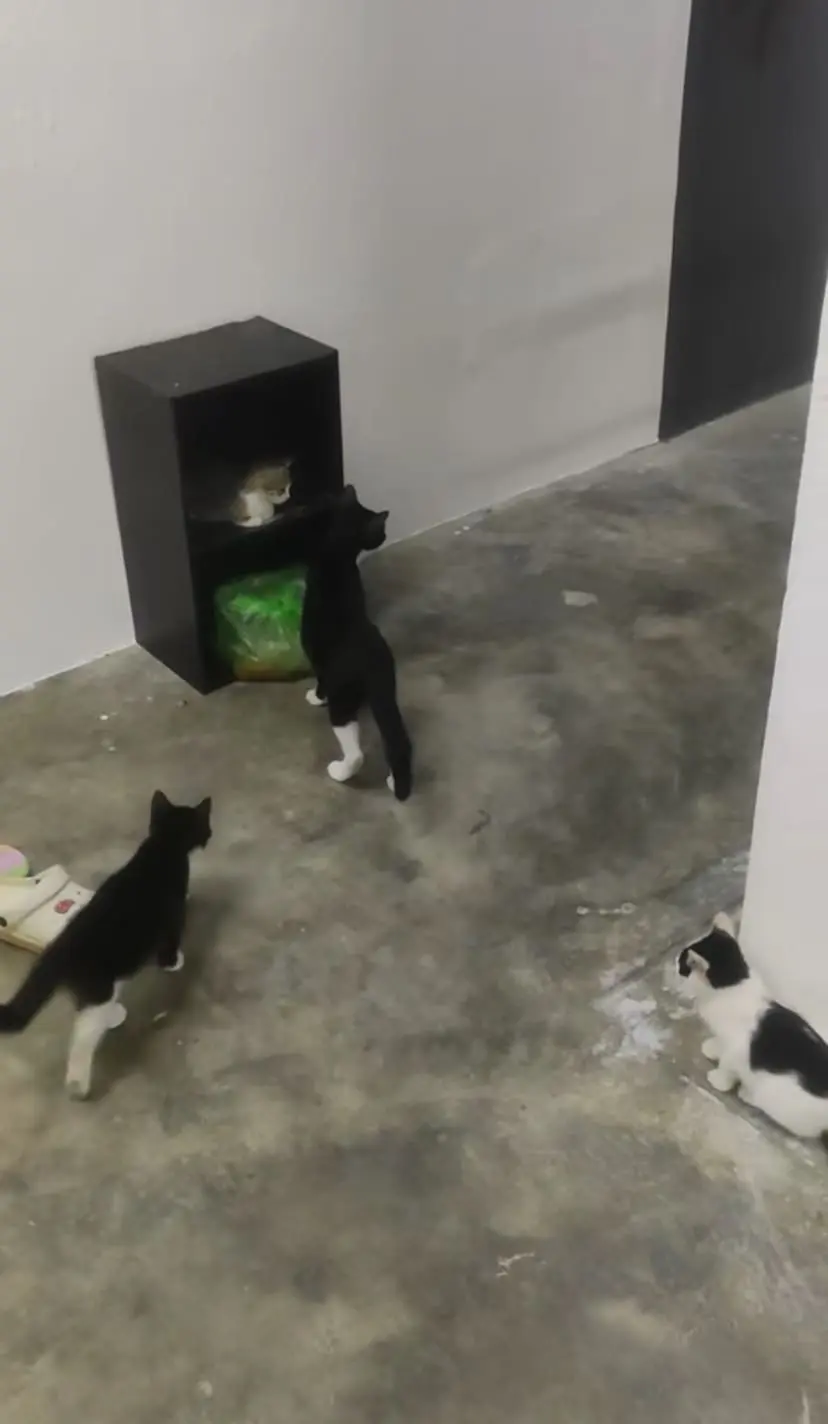 The anticipation among a few kittens, eagerly awaiting their mother’s arrival, is palpable as she approaches, laden with the promise of nourishment.