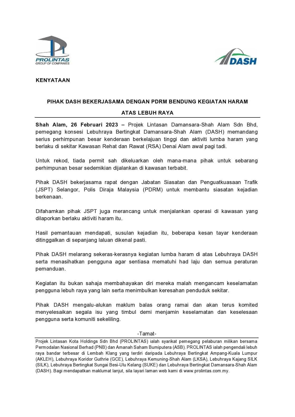 In the statement, Prolintas said that large gatherings are not allowed near the Denai Alam area and that they’re working closely with the Selangor Traffic Investigation and Enforcement Department (JSPT) and police.