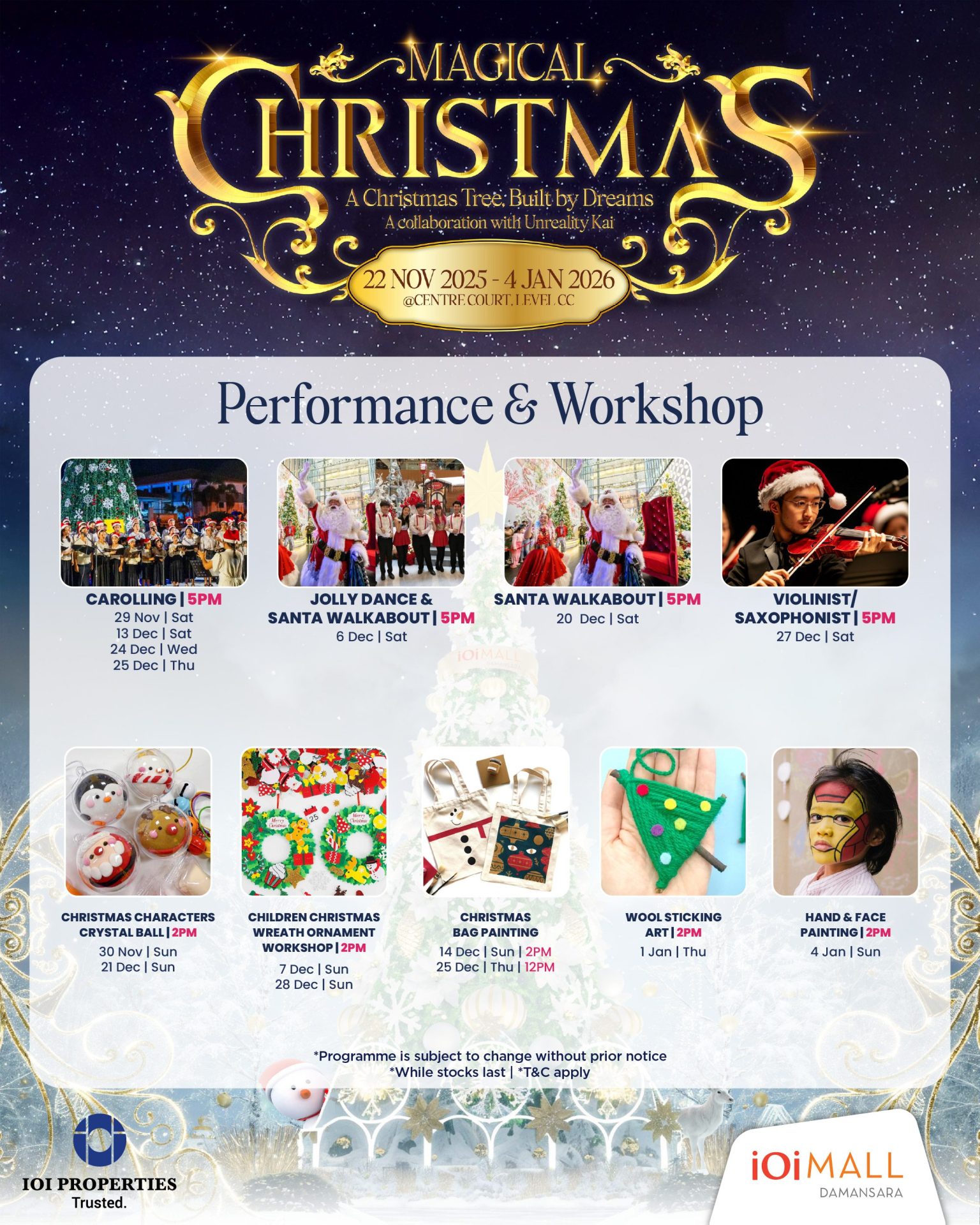 Every weekend, IOI Mall Damansara transforms into a lively Christmas playground. At 2PM, you can dive into a variety of hands-on festive workshops, including Xmas Characters Crystal Ball Making, Children X mas Wreath Ornament Workshop, Xmas Bag Painting and colourful Hand and Face Painting sessions.