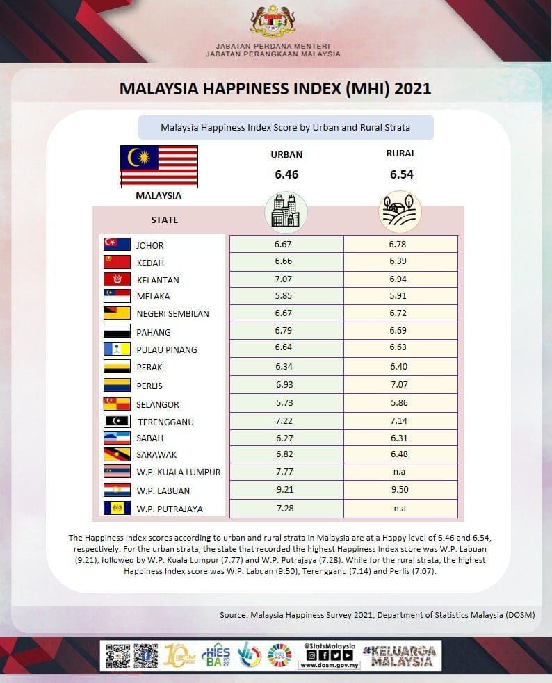 PUTRAJAYA – The Malaysia Happiness Index (MHI) 2021 that was announced by Department of Statistics Malaysia (DOSM) resulted an overall happiness score of 6.48 in the Happy level, reported by The Star.