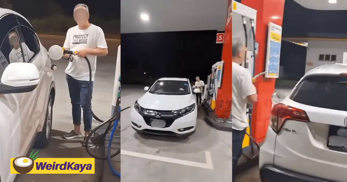 Instead of acknowledging his actions and apologising for it, the man remained defiant and continued to pump RON95 petrol into his car.
