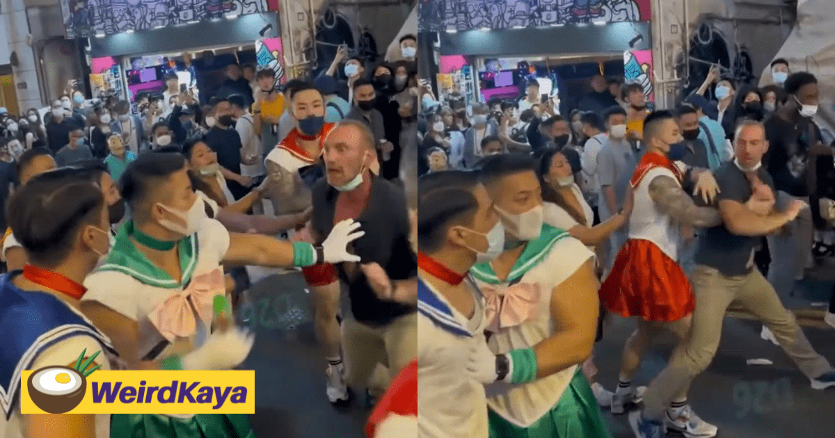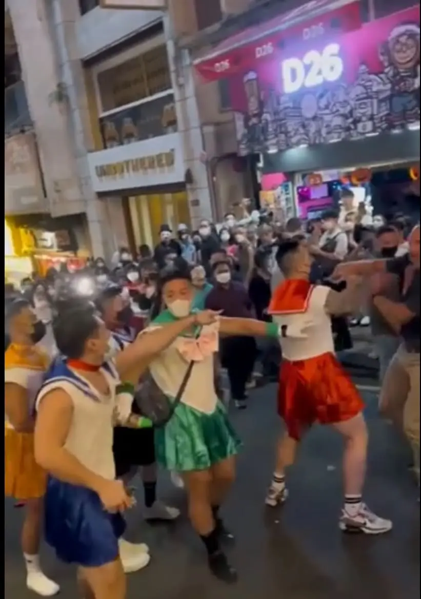 As he was being pulled away, the angmoh fell to the ground. When he got back to his feet, he took off his shirt and tried blocking their path but the group of ripped Sailor Moons simply walked off and blended in with the crowd.