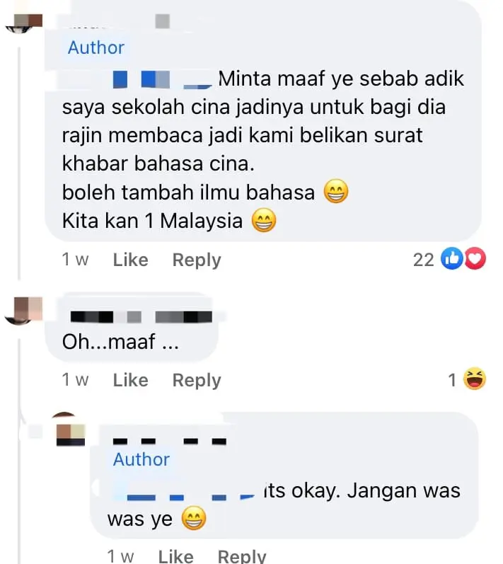 The seller later provided an explanation, stating, “I apologize if it may seem strange, but my younger sibling attends a Chinese school, so we bought a Chinese newspaper to encourage them to read and learn the language. We believe in embracing knowledge and promoting unity in our diverse country, Malaysia.”
