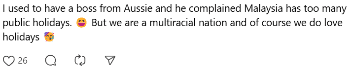 “I used to have a boss from Aussie and he complained Malaysia has too many public holidays. But we are a multiracial nation and of course, we love holidays.”