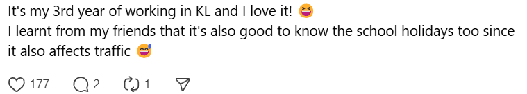“It’s my 3rd year of working in KL and I love it! I learned from my friends that it’s also good to know the school holidays too since it also affects traffic.”