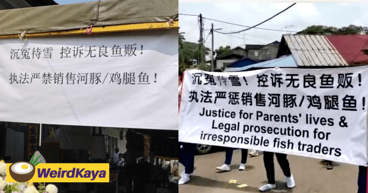 Family members of the couple who died after eating pufferfish recently displayed banners in both Chinese and English in front of the funeral procession, condemning the unscrupulous fishmonger and calling for the government to enforce a ban on the sale of pufferfish in Malaysia.
