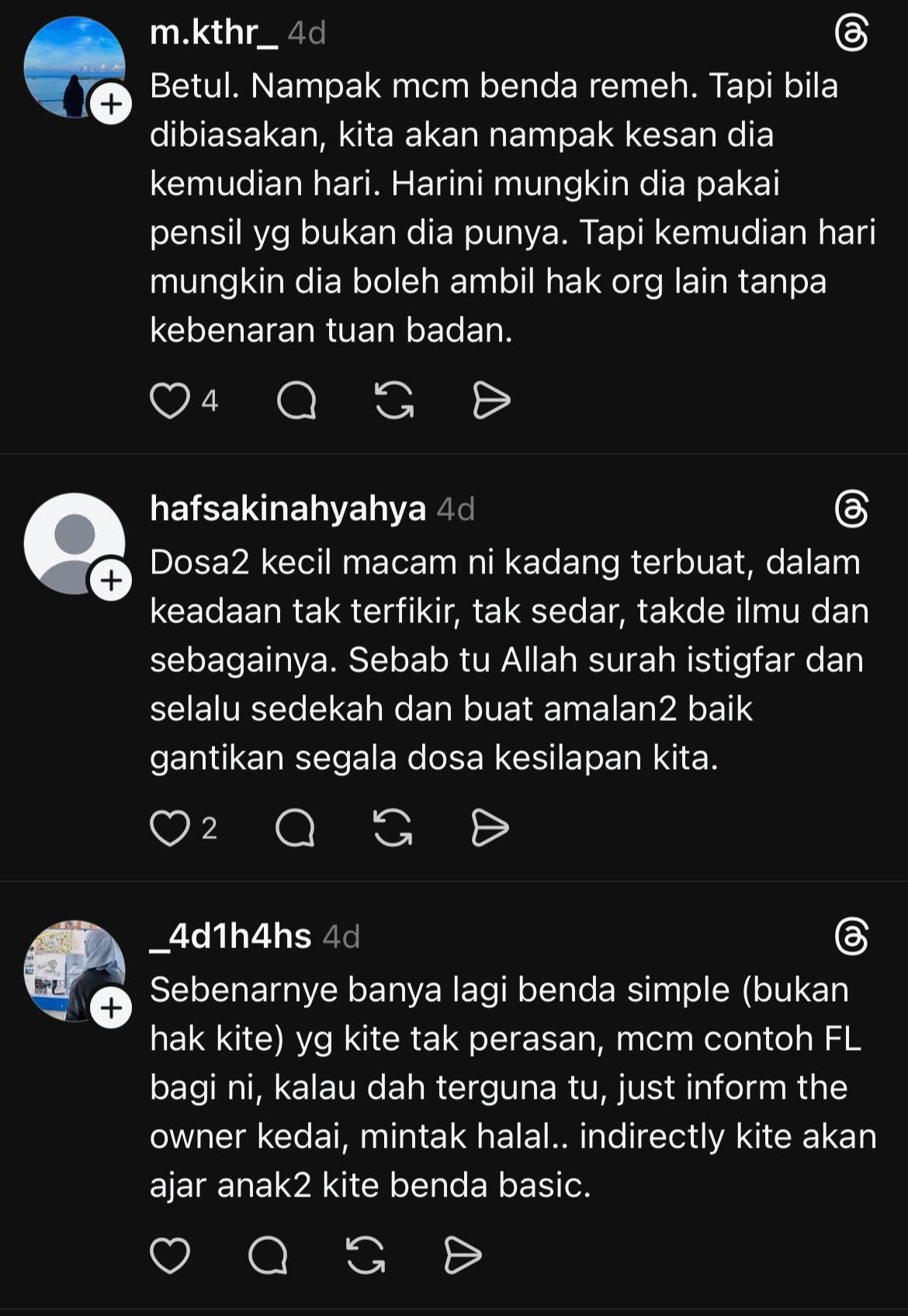 “Jangan main-main dengan ‘apalah sangat’, benda yang bukan hak kita haram diguna. Jangan biasakan, jangan ajar anak untuk biasakan,” jelasnya.