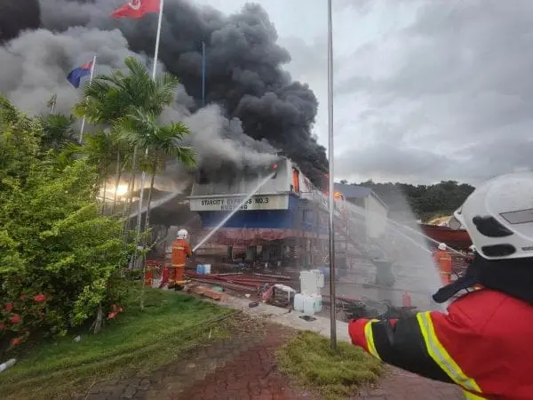 A ferry undergoing repairs at the Bukit Malut, Langkawi shipyard caught fire yesterday afternoon (11 Nov).