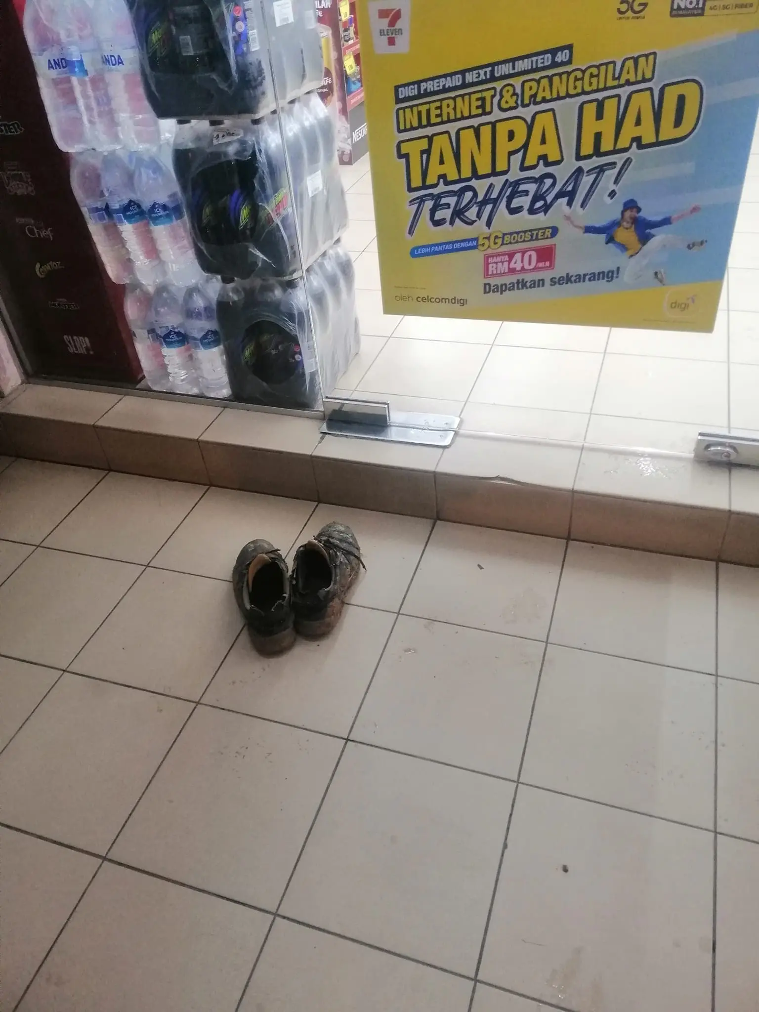 Rohaizah was just about to pop into a nearby convenience store when she spotted something unusual: a pair of muddy shoes, carefully placed outside the store’s entrance. What she discovered inside the store was even more surprising.