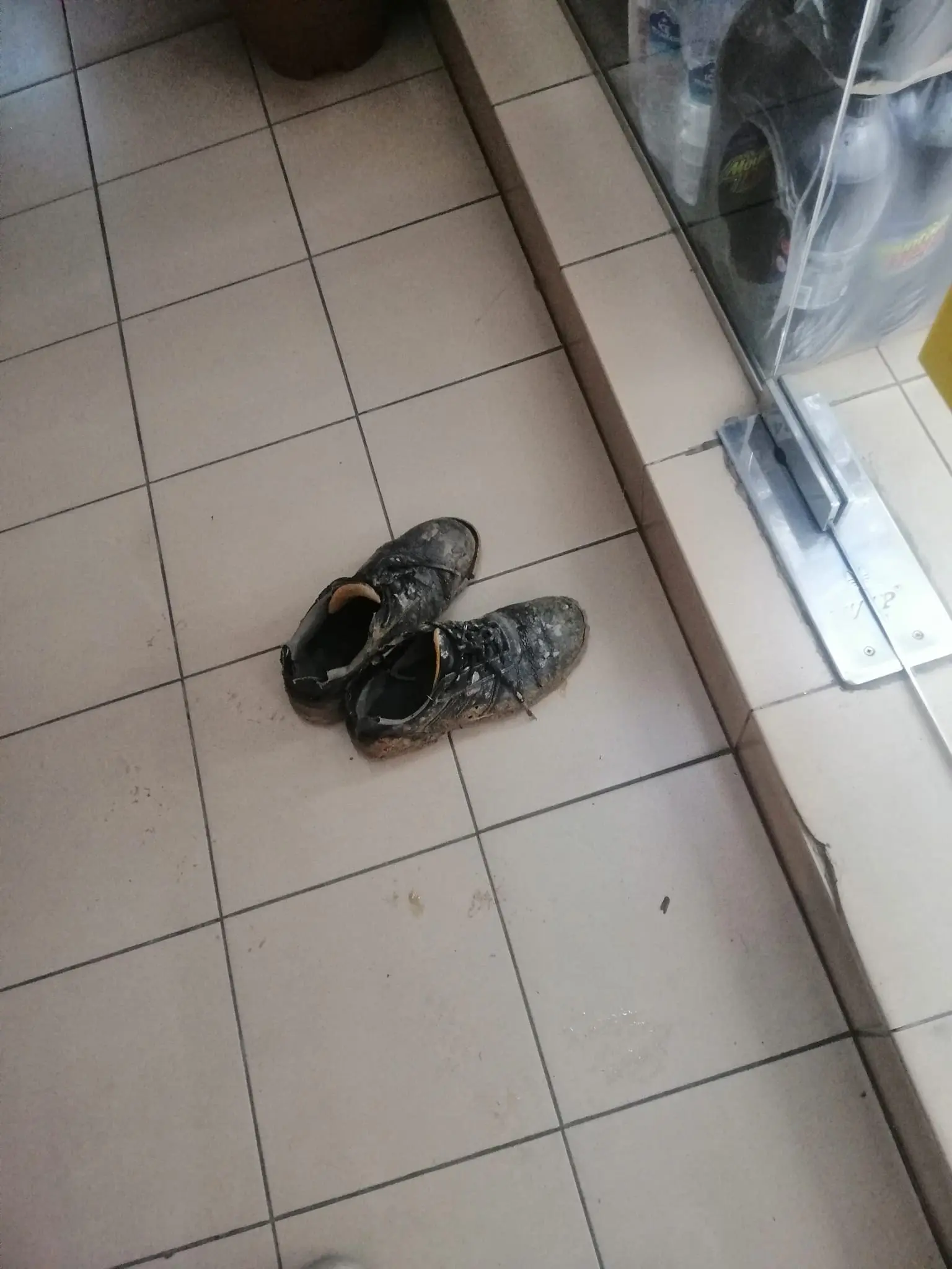 A pair of muddy shoes outside the store